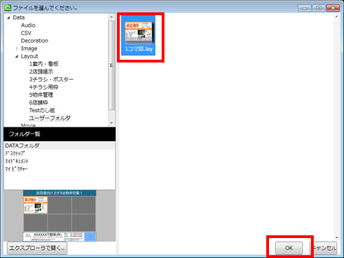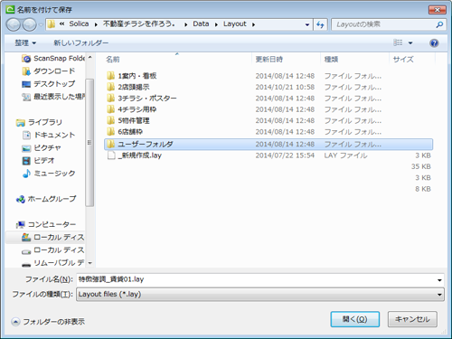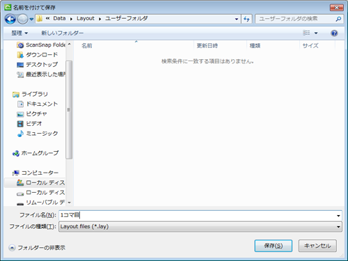 「ユーザーフォルダ」を選択すると、先ほど作成した「1コマ目.lay」が表示されます。