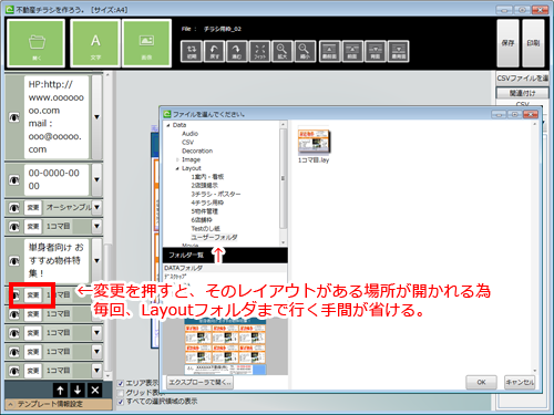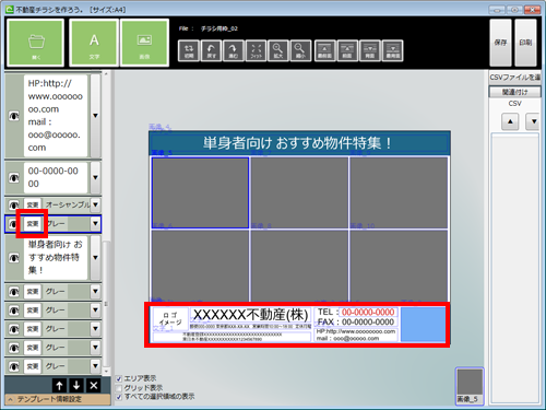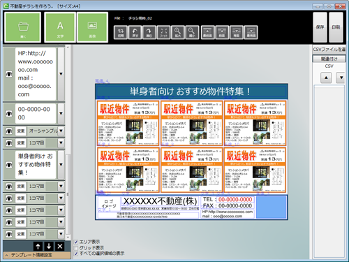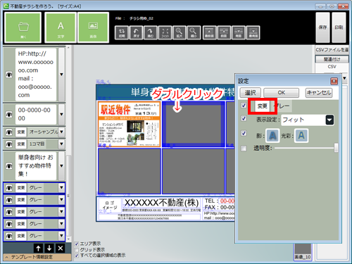 ・中央部は、レイアウト画面です。文字や画像をダブルクリックすると、詳細設定画面が開きます。