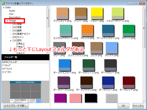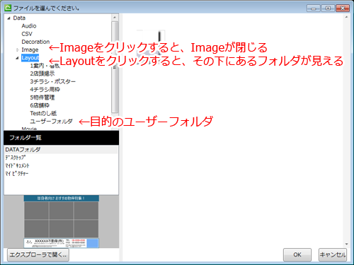 内蔵画像やテンプレートが保存されているフォルダを開くことができます。