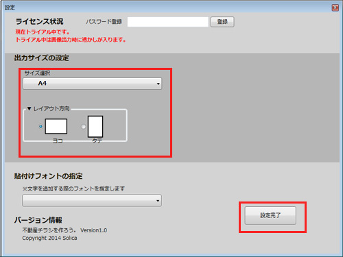 出力サイズを指定するには「設定」を押して下さい。